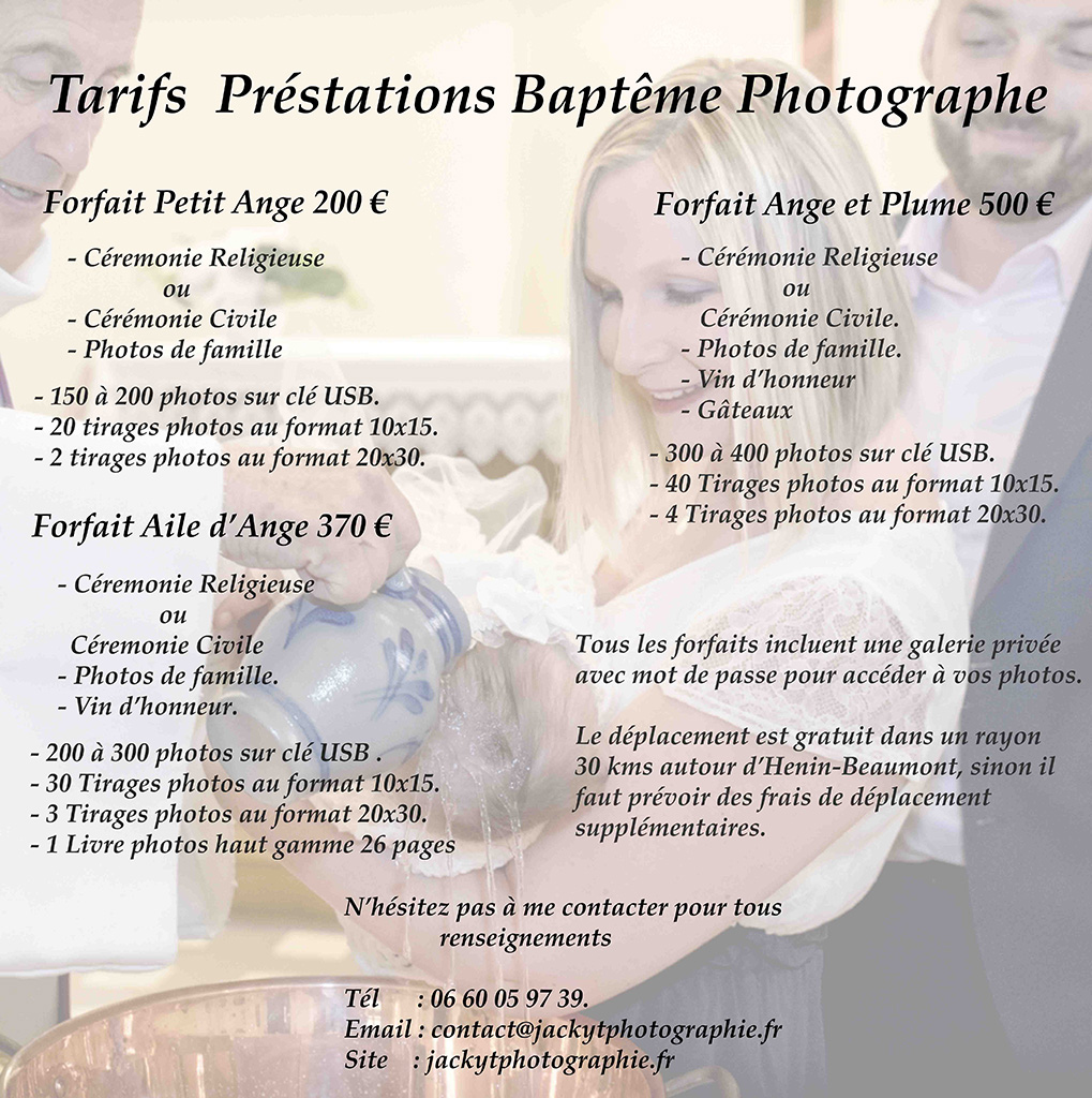 Ma plaquette avec mas Tarifs photographe baptême, pour un choix rapide et simple.